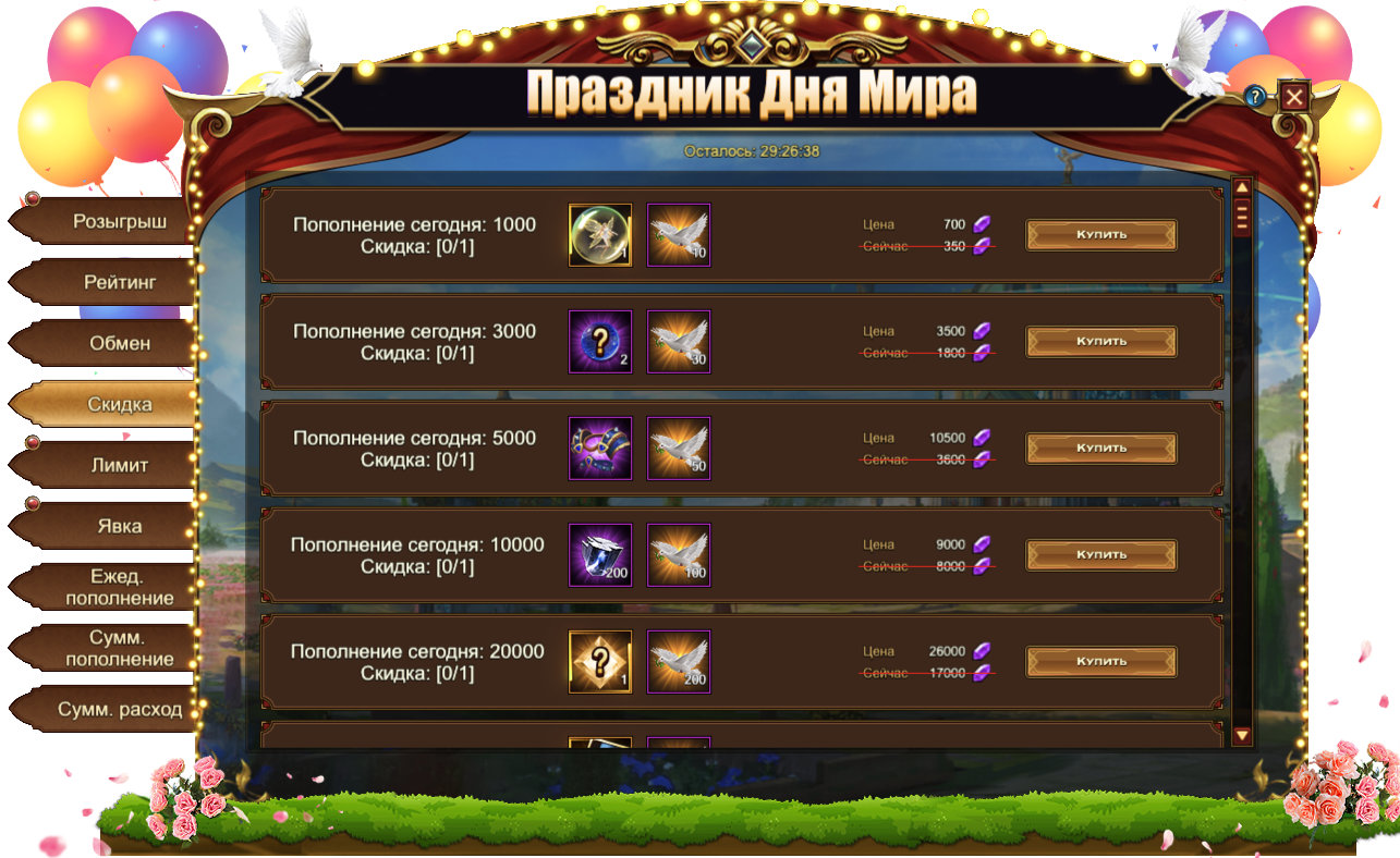Обратите внимание, для активации скидки необходимо выполнить условие из первого столбца. Например, на скриншоте ниже, для приобретения со скидкой набора из Легендарного Эльфа и 10 Голубей мира необходимо пополнить счет на 1000.