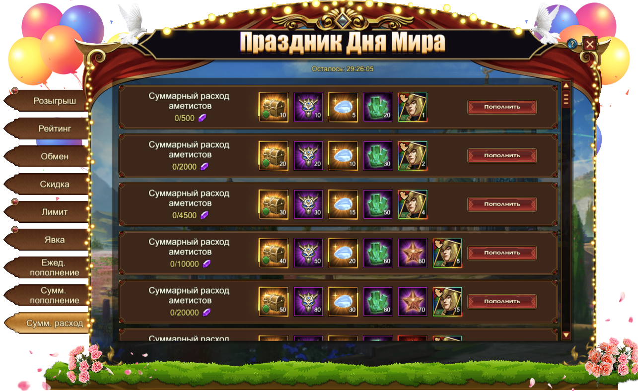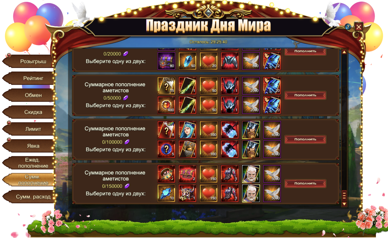 За пополнение счета на определенное количество аметистов за один день, вы можете получить: Сундук камней элементаля 3 ур., Голубь мира, Сундук кристаллов 4 ур., Сердце мира, Сфера священного наряда, Обучающее устройство, Сундук карт SSR, Сундук самоцветов 7 ур., Кодекс крыльев святости, Сундук книг навыков, Песок темной звезды, Оранжевое созвездие, Сущность артефакта, Фрагмент крыльев трансформера, Сундук редкостей, Сундук с кодексом, [Фрагмент] Глейпнир, [Фрагмент карты] Тюр.