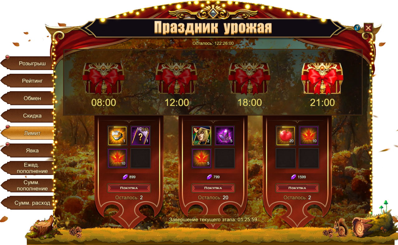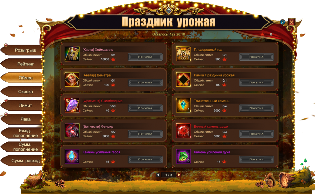 Кленовые листы, собранные во время данного Фестиваля, позволяют приобрести множество интересных предметов, в том числе и эксклюзивных для данного события: [Карта] Хеймдалль, Особый титул Плодородный год[Аватар] ДеметраРамка праздника урожая[Фрагмент] Скидбладнир. Если эксклюзивные предметы вас не интересуют, всегда можно обменять Бочки пива на полезные ресурсы. Например, на Вечный камень душиКристалл туманности или [Бог чести] Фенрир