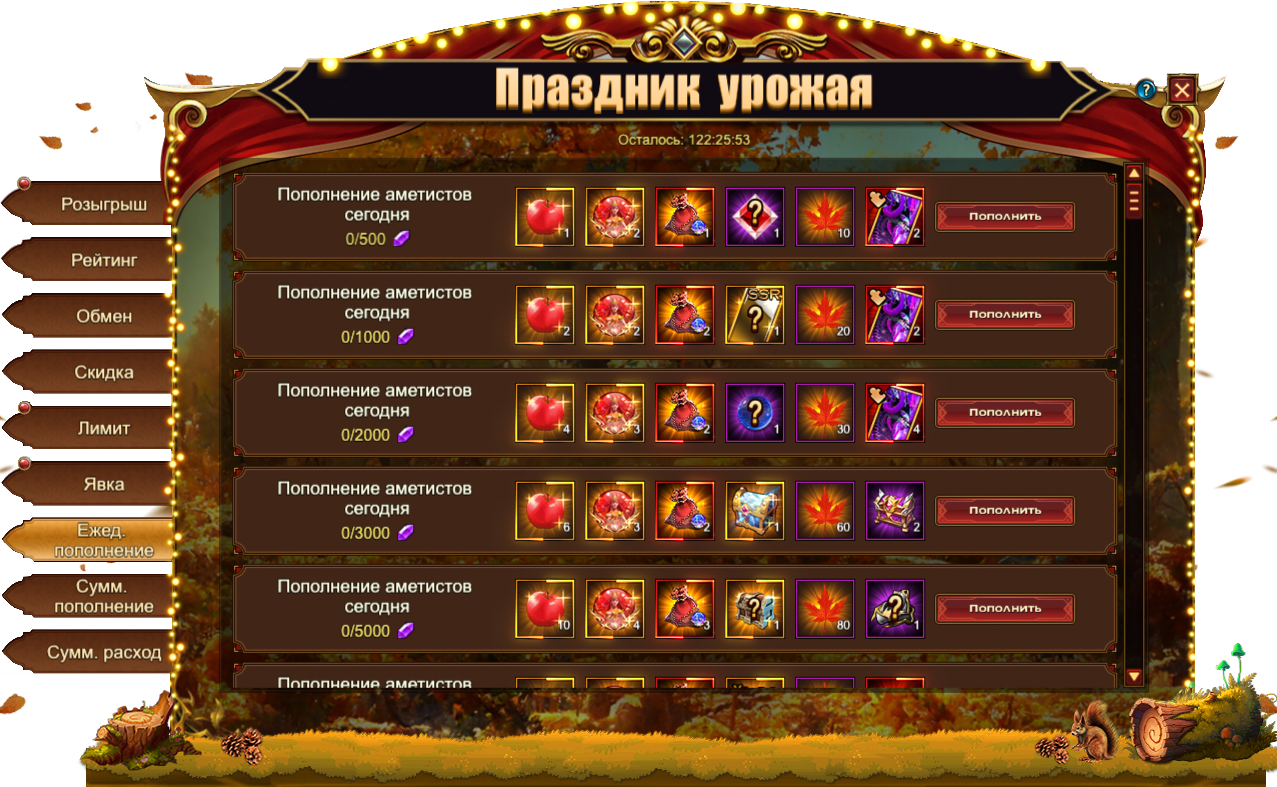 За пополнение счета на определенное количество аметистов за один день, вы можете получить: Сундук кристаллов 6 ур., Фиолетовое созвездие, Сундук снаряжения скакуна (фиол.)Сундук камней элементаля 4 ур., Кленовый лист, Сундук карт SSRЯблочкоДуша богини, Сундук самоцветов 7 ур., Сундук книг навыков, Кодекс крыльев святости, Сундук снаряжения героя (оранж.)Сущность артефактаСундук редкостейСундук с кодексом, [Фрагмент] Дракон Тьмы, Красное созвездие, [Фрагмент] Брисингамен, [Фрагмент карты] Тюр.
