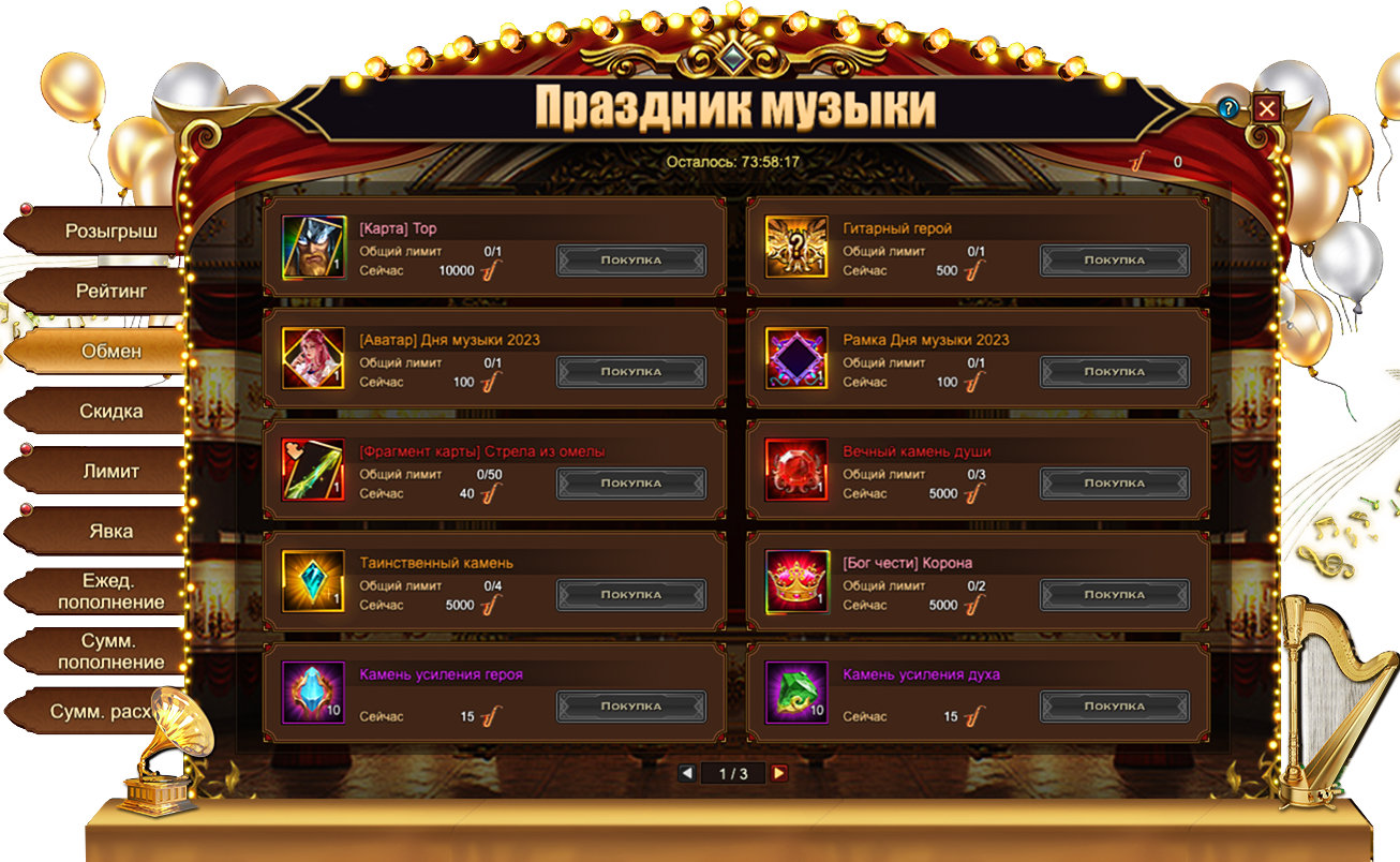 Саксофоны, собранные во время данного Фестиваля, позволяют приобрести множество интересных предметов, в том числе и эксклюзивных для данного события: [Карта] Локи, Особый титул Гитарный герой, [Аватар] День музыки 2023, Рамка Дня музыки 2023, [Фрагмент] Брисингамен. Если эксклюзивные предметы вас не интересуют, всегда можно обменять Бочки пива на полезные ресурсы. Например, на Вечный камень души, Кристалл туманности или [Бог чести] Меч.