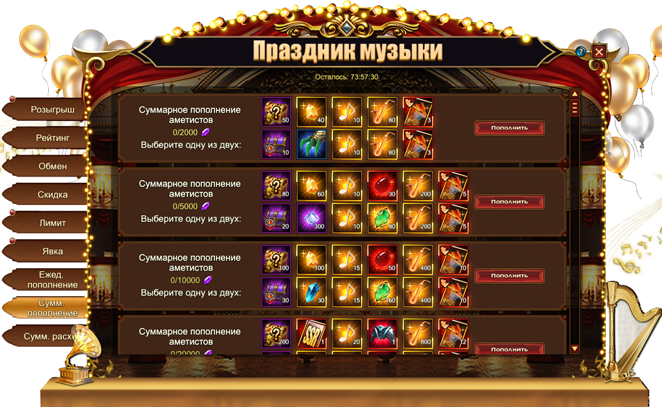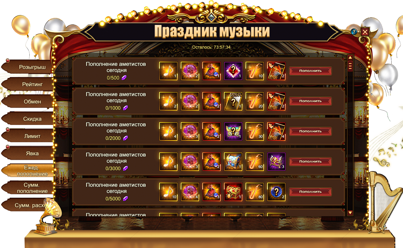 За пополнение счета на определенное количество аметистов за один день, вы можете получить: Сундук кристаллов 5 ур.Сундук магических ядер 3 ур.Сундук камней элементаля 4 ур.НотаСаксофонДуша обликаОранжевое созвездиеСундук самоцветов 7 ур., Сундук снаряжения скакуна (оранж.), Сундук книг нвыков (оранж.)Сундук снаряжения героя (оранж.), [Эпич.] Стигмат, Сущность артефактаСундук редкостейСундук с кодексомФрагмент лисицы, [Фрагмент карты] Тюр.