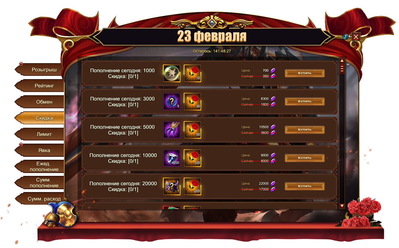Обратите внимание, для активации скидки необходимо выполнить условие из первого столбца. Например, на скриншоте ниже, для приобретения со скидкой набора из Легендарного Эльфа и 10 Букетов необходимо пополнить счет на 1000.