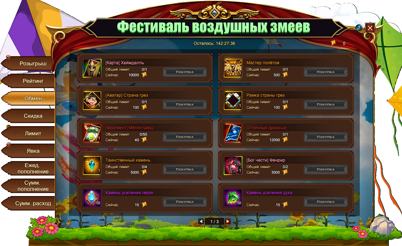 Свечи, собранные во время данного Фестиваля, позволяют приобрести множество интересных предметов, в том числе и эксклюзивных для данного события: [Карта] Хеймдалль, титул Мастер полетов, [Аватар] Страна грез, Рамка страны грез, [Фрагмент] Мегингъёрд. Если эксклюзивные предметы вас не интересуют, всегда можно обменять Золотые воздушные змеи на полезные ресурсы. Например, на Таинственный каменьОтличный дракоша или [Бог чести] Фенрир