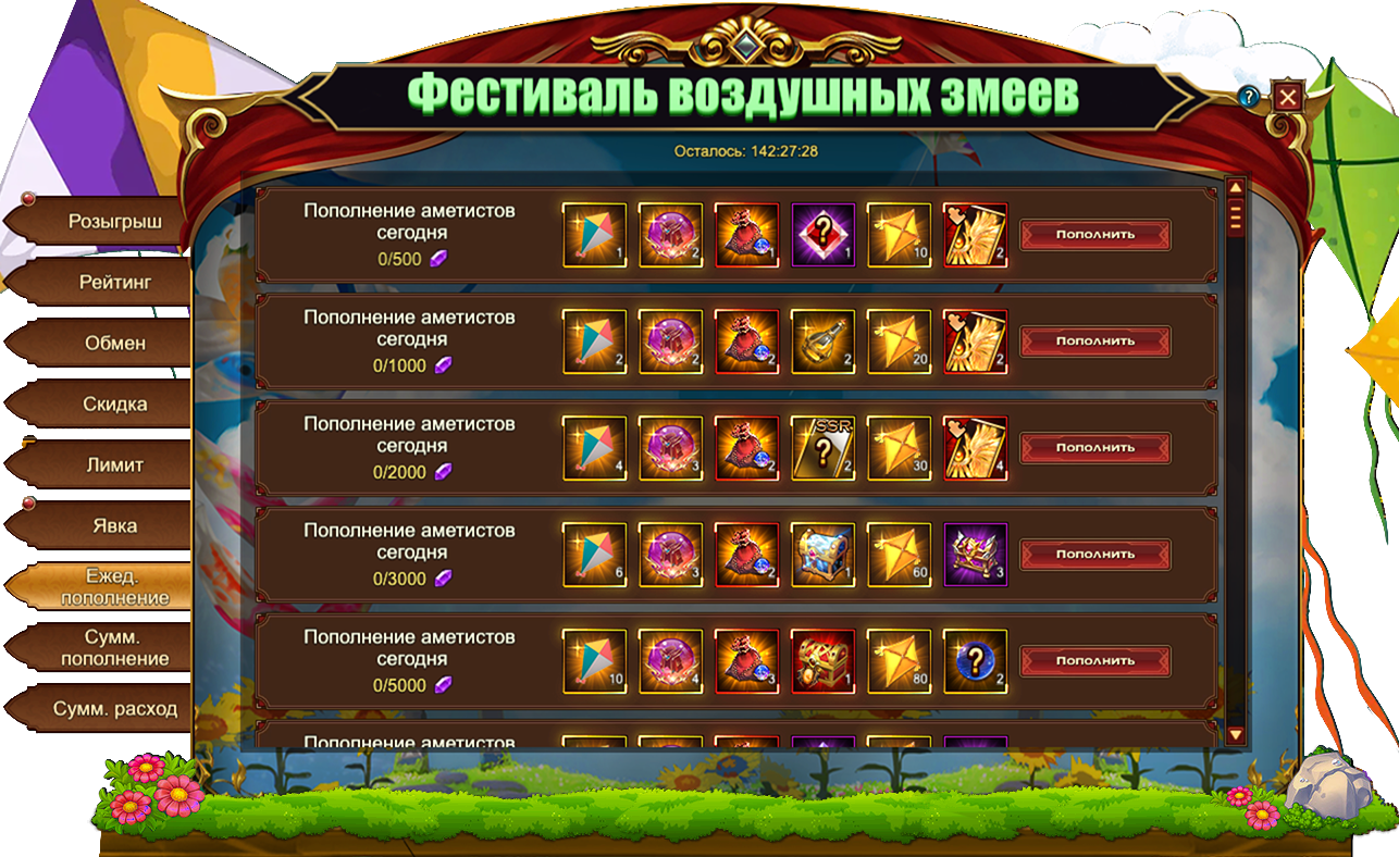 За пополнение счета на определенное количество аметистов за один день, вы можете получить: Сундук кристаллов 6 ур., Сундук камней элементаля 4 ур., Сундук снаряжения героя (фиол.), Лунный камень души, [Героич.] Стигмат, Сундук карт SSR, Воздушный змей, Золотой воздушный змей, Душа облика, Зелье навыка, Сундук самоцветов 7 ур., Кодекс крыльев святости, Сундук снаряжения питомца (оранж.), Сущность артефакта, Оранжевое созвездие, Сундук редкостей, Сундук с кодексом, Фрагмент крыльев возрождения[Фрагмент карты] Тюр.