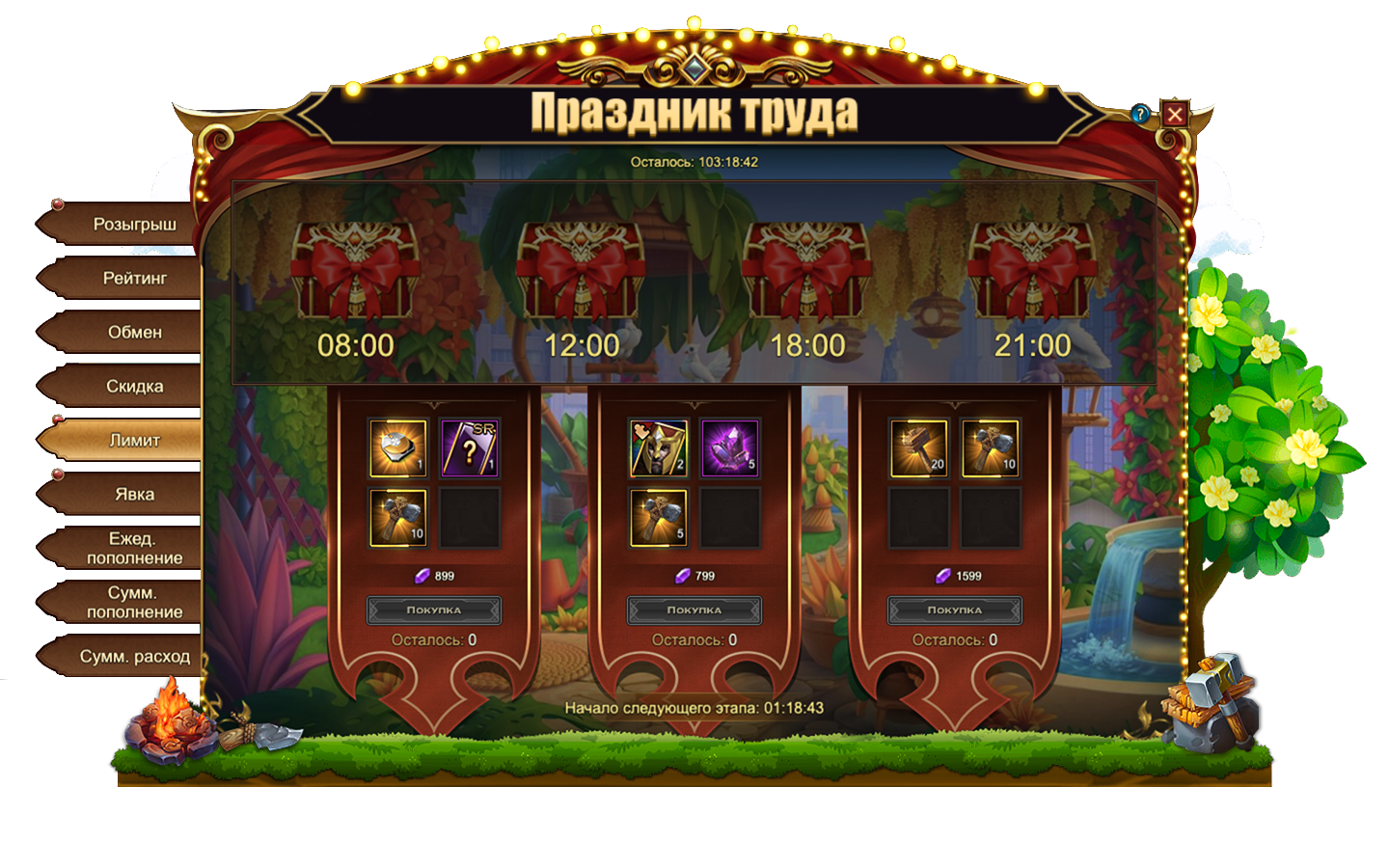 Здесь любопытные искатели приключений могут отыскать временные предложения, доступные в течение ограниченного времени и в ограниченном количестве. Группы товаров доступы с 8:00 до 11:59, с 12:00 до 17:59, с 18:00 до 20:59 и с 21:00 до 7:59. В этот раз вы можете получить в том числе: МолотокКиянкаЧароит, Сундук карт SR, Обучающее устройство, [Фрагмент карты] Хеймдалль.
