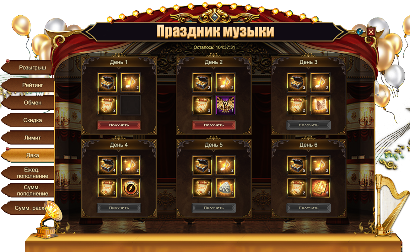За посещение события ежедневно становятся доступны различные подарки. Например: Ноты, Сумка золота, Оранжевый свиток опыта, уникальный титул Выдающийся певец, Потерянная карта, Пропуск на Арену и Свиток славы.