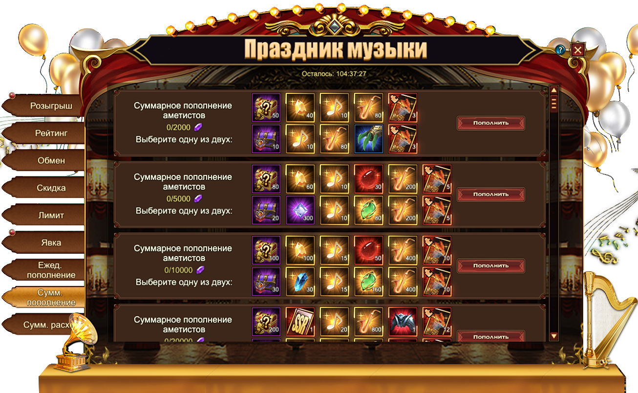 За пополнение счета на определенное количество аметистов за один день, вы можете получить: Сундук кристаллов 6 ур., Сундук камней элементаля 4 ур., Сундук магических ядер 3 ур., Ноты, Саксофон, Душа облика, Песок темной звезды, Сундук карт SSR, Сундук самоцветов 7 ур., Оранжевое созвездие, [Эпич.] Стигмат, Сундук снаряжения героя (оранж.), Сундук книг навыков, Сундук снаряжения скакуна (оранж.), Сущность артефакта, Сундук редкостей, Фрагмент лисицы, Сундук с кодексом, [Фрагмент карты] Тюр.