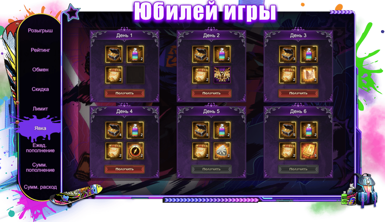 За посещение события ежедневно становятся доступны различные подарки. Например: Баллончик с краской, Сумка золота, Оранжевый свиток опыта, уникальный титул 3 юбилей, Потерянная карта, Пропуск на Арену и Свиток славы.