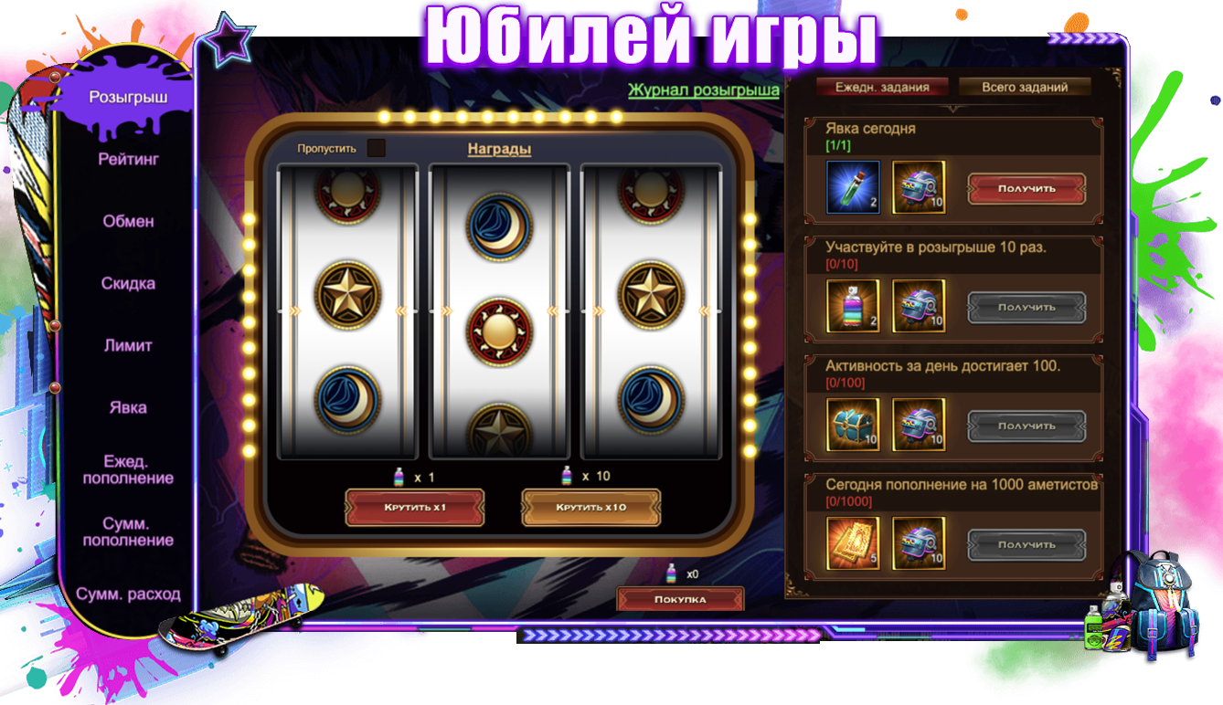 За пополнение счета на определенное количество аметистов за один день, вы можете получить: Сундук кристаллов 5 ур., Сундук камней элементаля 4 ур., Баллончик с краской, VR шлем, Цитрин, Песок темной звезды, Сундук кристаллов 7 ур., Сундук книг навыков, Дух крыльев святости, Сундук снаряжения питомца (оранж.), Оранжевое созвездие, Сундук снаряжения героя (оранж.), Турмалин, Сущность артефакта, Сундук редкостей, Фрагмент крыльев плащевидных, [Фрагмент карты] Тюр.