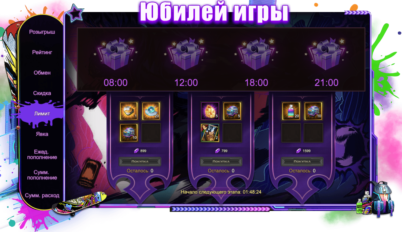 Обратите внимание, для активации скидки необходимо выполнить условие из первого столбца. Например, на скриншоте ниже для приобретения со скидкой набора из 10 Баллончиков с краской и 10 VR шлемов необходимо пополнить счет на 1000.