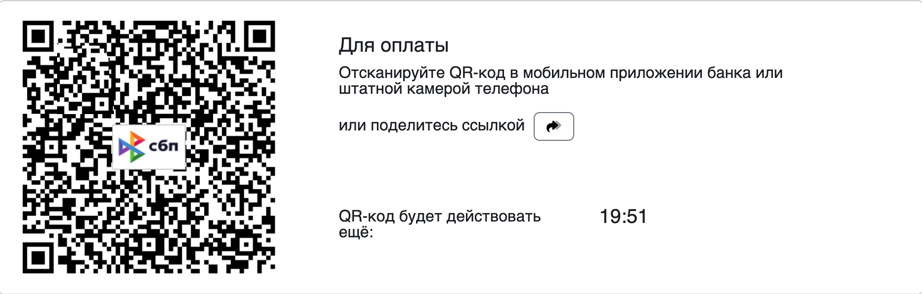 После чего система автоматически генерирует уникальный QR-код для совершения оплаты. Данный код необходимо отсканировать при помощи банковского приложения или штатной камеры телефона, после чего завершить оплату, следуя подсказкам на телефоне. QR-код действителен 20 минут с момента создания. Не пытайтесь отсканировать QR-код на изображении ниже, он служит лишь для иллюстрации.
