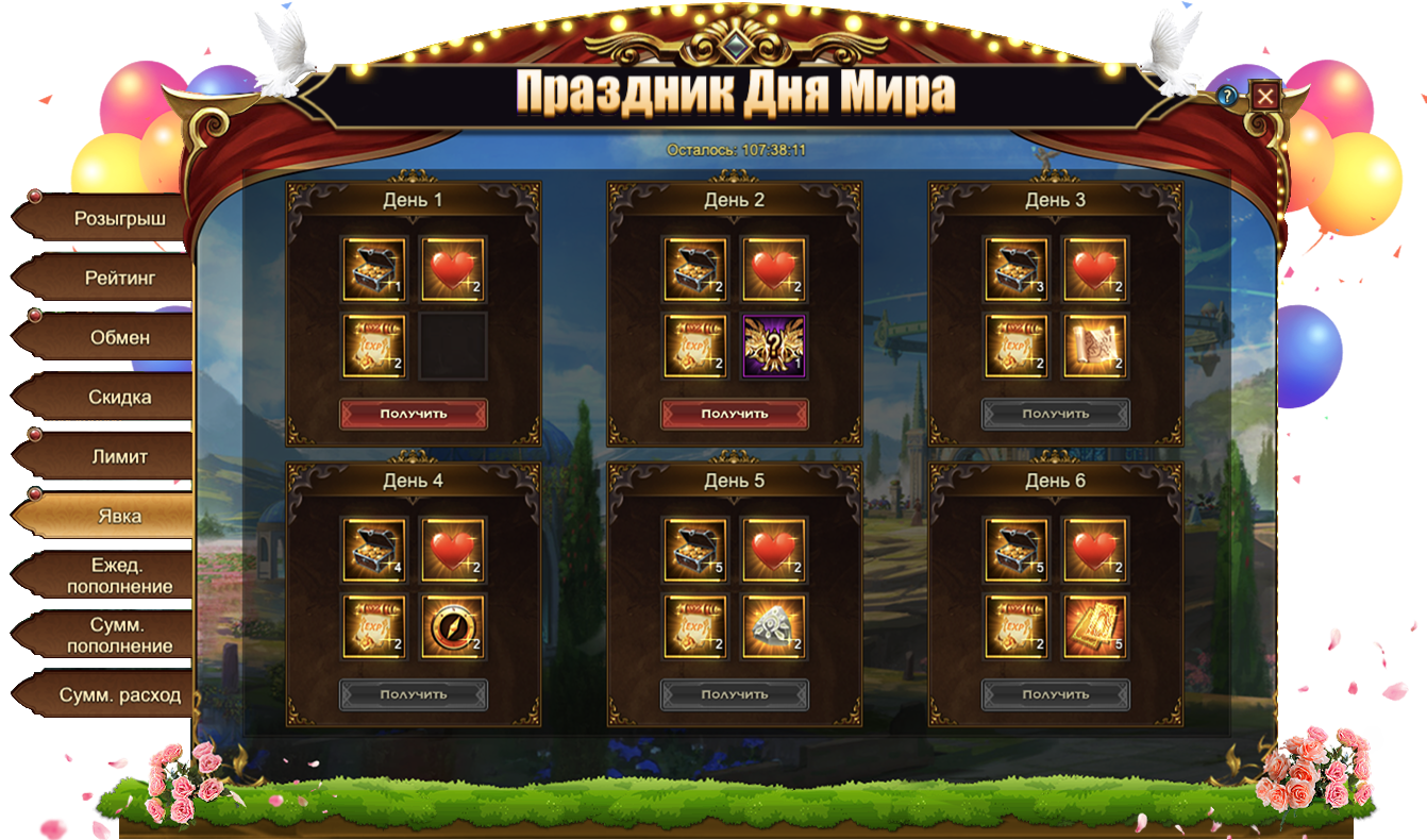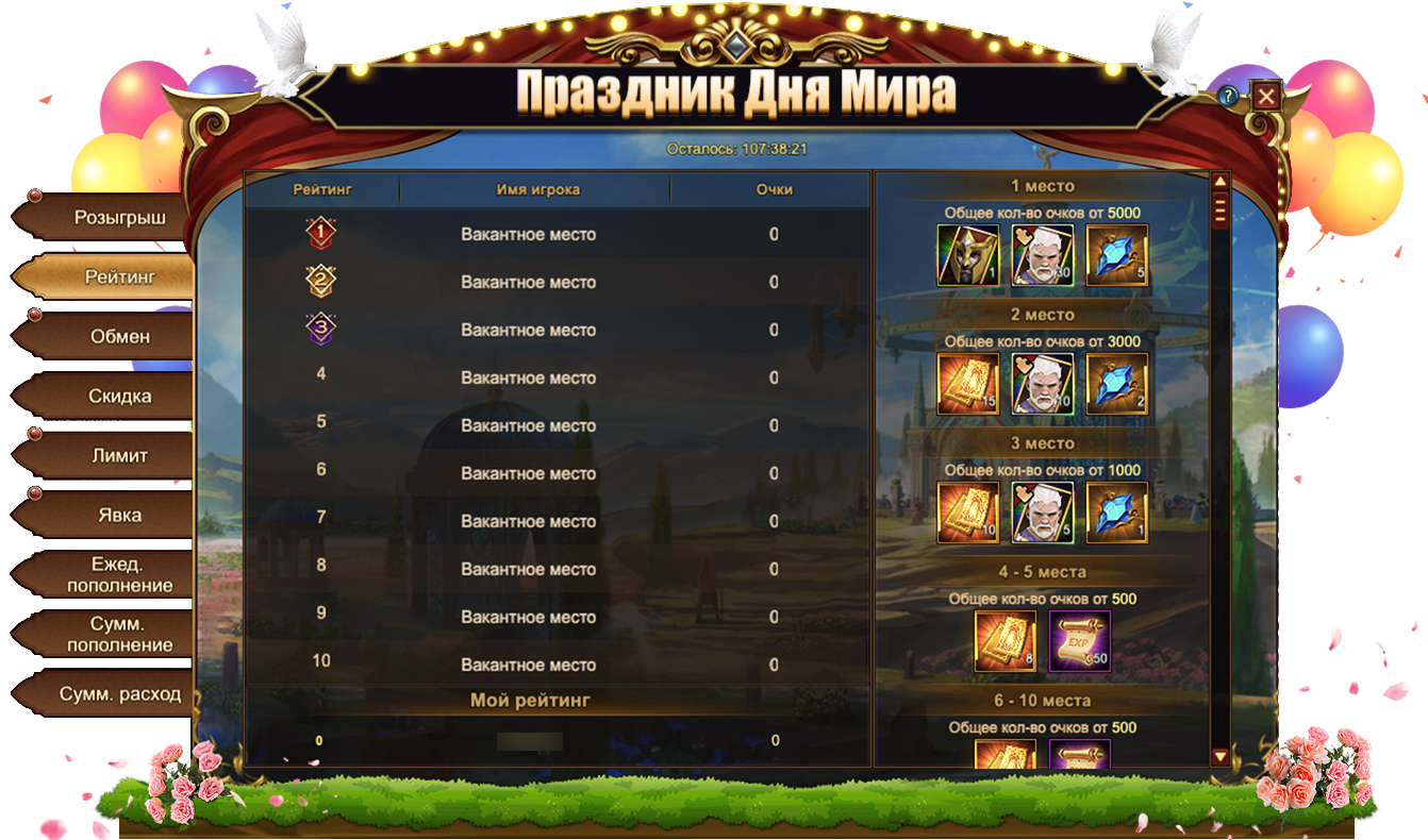 Участвуйте в розыгрыше различных ценных предметов, чтобы получить: Рутил, Чароит, Мрачные одежды, Сундук кристаллов 5 ур., Свиток славы, Кристалл чар демона, Песок темной звезды, Эльдримнир, Сундук наряда Валькирии, Кристалл души крыльев, Фрагмент Дракона и даже великолепный Дракон целиком!