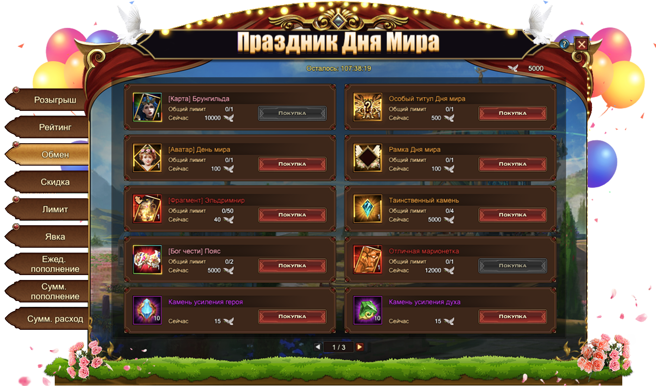 Голуби мира, собранные во время данного Фестиваля, позволяют приобрести множество интересных предметов, в том числе и эксклюзивных для данного события: [Карта] БрунгильдаОсобый титул Дня мира[Аватар] День мираРамка Дня мира[Фрагмент] Эльдримнир. Если эксклюзивные предметы вас не интересуют, всегда можно обменять Голубей мира на полезные ресурсы. Например, на Таинственный каменьОтличная марионетка или [Бог чести] пояс
