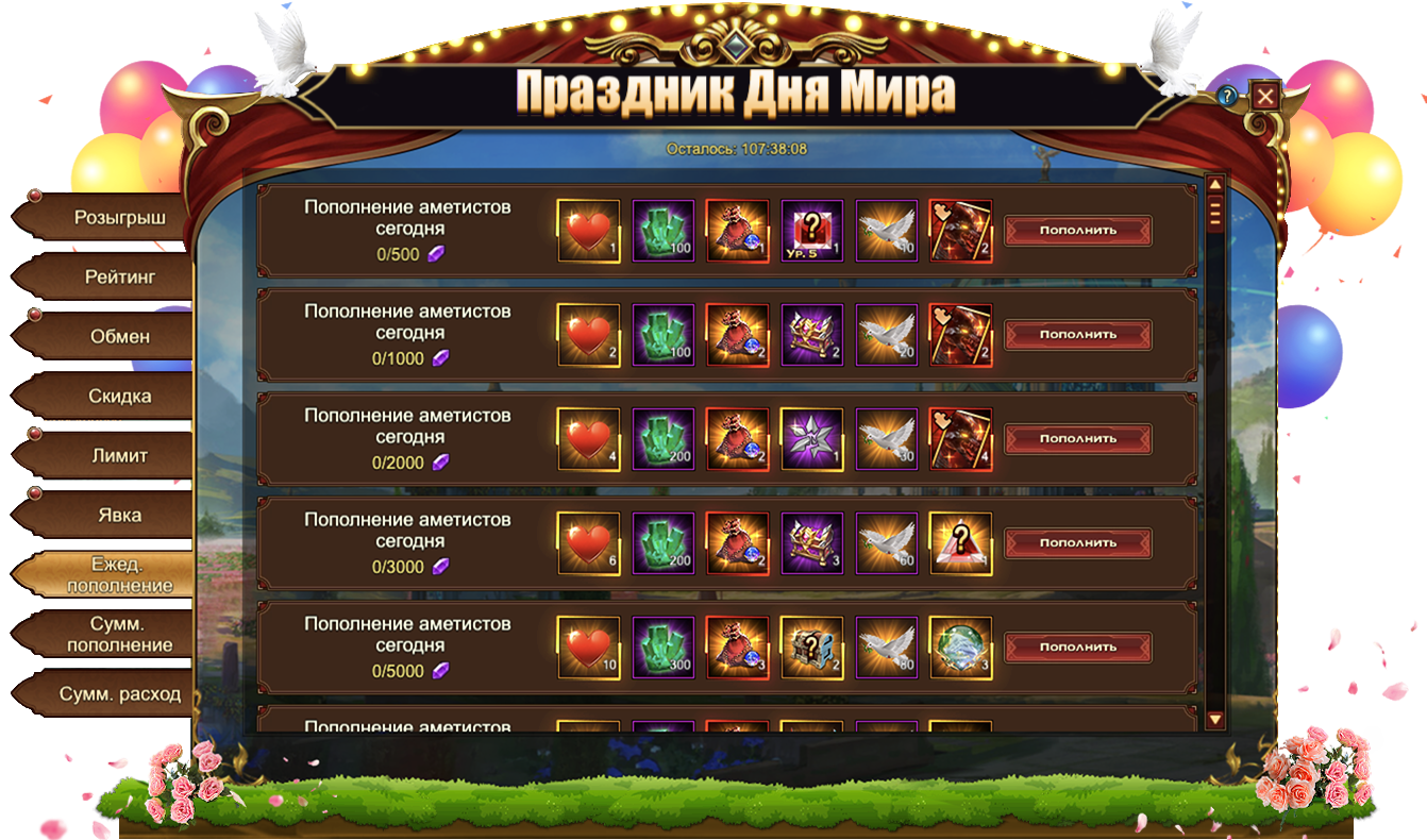 За пополнение счета на определенное количество аметистов за один день, вы можете получить: Сундук кристаллов 5 ур., Сундук камней элементаля 4 ур., Изумруд, Голубь мираЖетон дня мира, Дух крыльев святости, Песок темной звезды, Сундук книг навыков, Сундук снаряжения питомца (оранж.), Сундук снаряжения героя (оранж.), Сущность артефакта, Турмалин, Сундук кристаллов 7 ур., Оранжевое созвездие, Фрагмент дракона, Сундук редкостей[Фрагмент карты] Тюр.