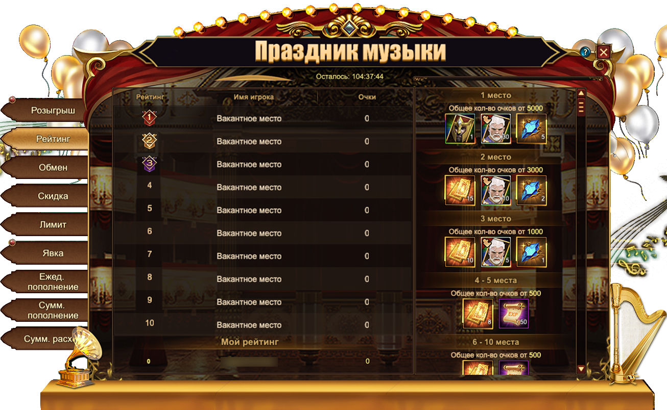 За посещение события ежедневно становятся доступны различные подарки. Например: Ноты, Сумка золота, Оранжевый свиток опыта, уникальный титул Выдающийся певецПотерянная карта, Пропуск на Арену и Свиток славы.