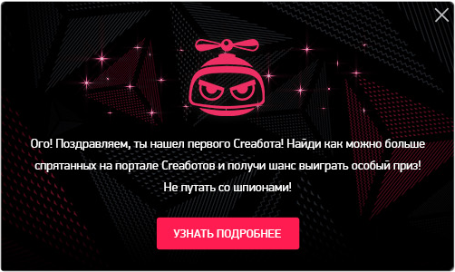 В рамках данного конкурса необходимо авторизоваться на портале CreaGamesотыскать CREAботов и нажать на них правой кнопкой мыши. После взаимодействия с первым найденным CREAботом отобразится специальное всплывающее окно как на изображении ниже: