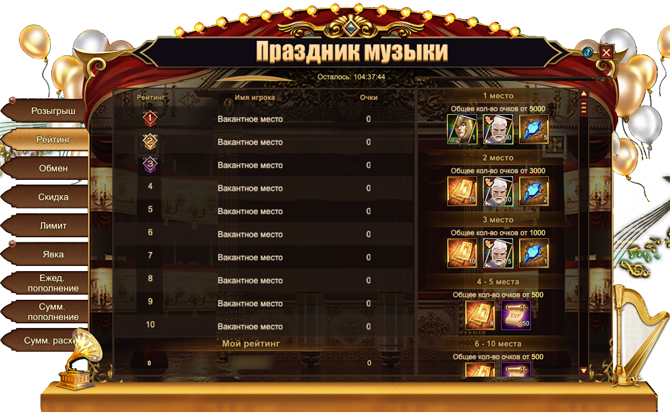 За участие в Розыгрыше вы получаете специальные очки, определяющие ваше положение в Рейтинге фестиваля. В зависимости от положения в рейтинге можно получить: Свитки славы, Сущность артефакта, [Фрагмент карты] Тюр, Фиолетовые свитки опыта и даже героя класса UR - всемогущего Тора!