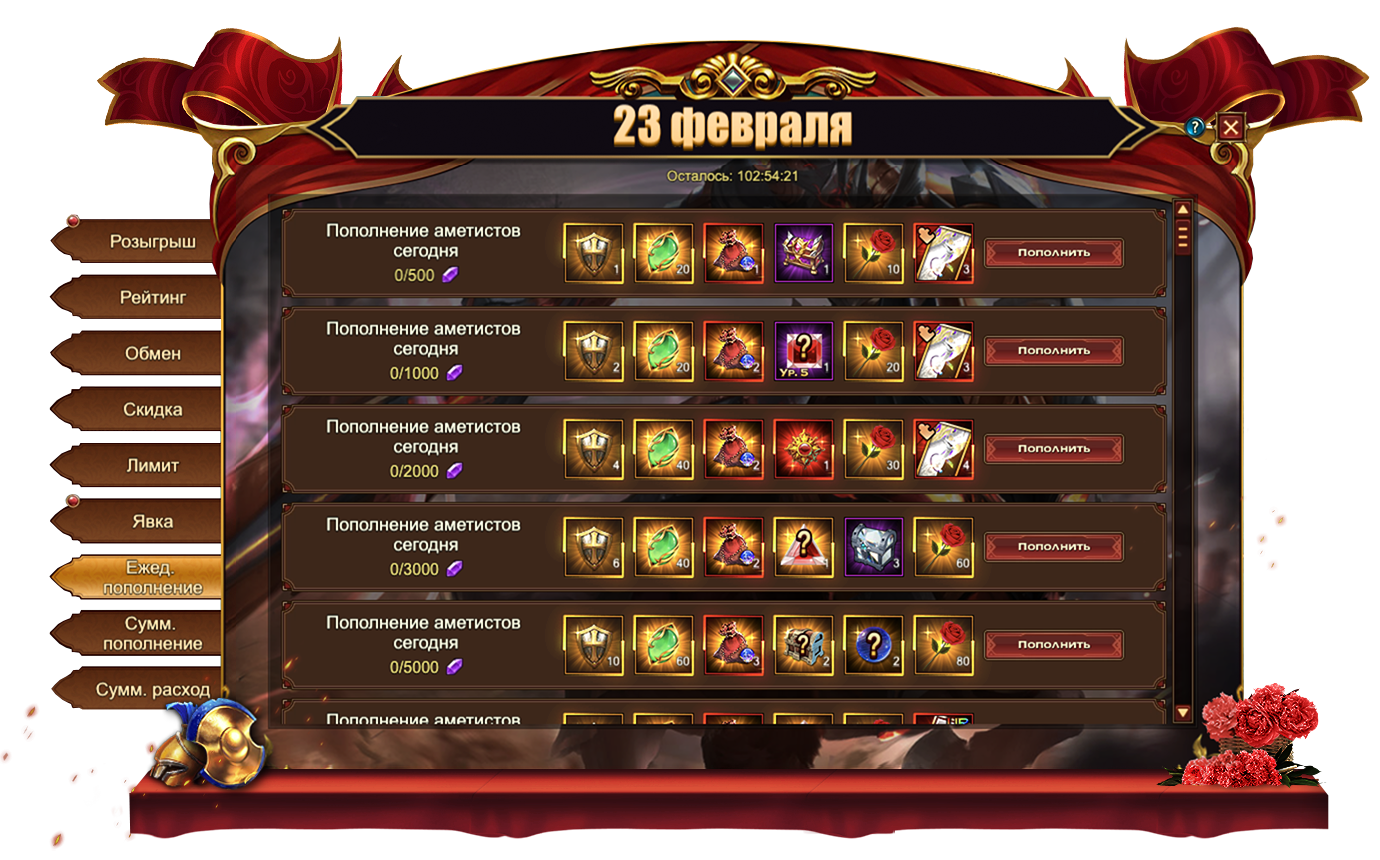 За пополнение счета на определенное количество аметистов за один день, вы можете получить: Сундук кристаллов 5 ур., Сундук камней элементалей 4 ур., Сундук самоцветов 6 ур., Орден, Цитрин, Букет, Сундук кристаллов 7 ур., Оранжевое созвездие, Сундук книг навыков, Сундук кристаллов 9 ур., Сундук с эссенцией стигмата, Сущность артефактаСундук редкостей, Письмо с молитвой, Фрагмент павлина, Сундук карт UR, Сундук самоцветов 9 ур., [Фрагмент карты] Тюр