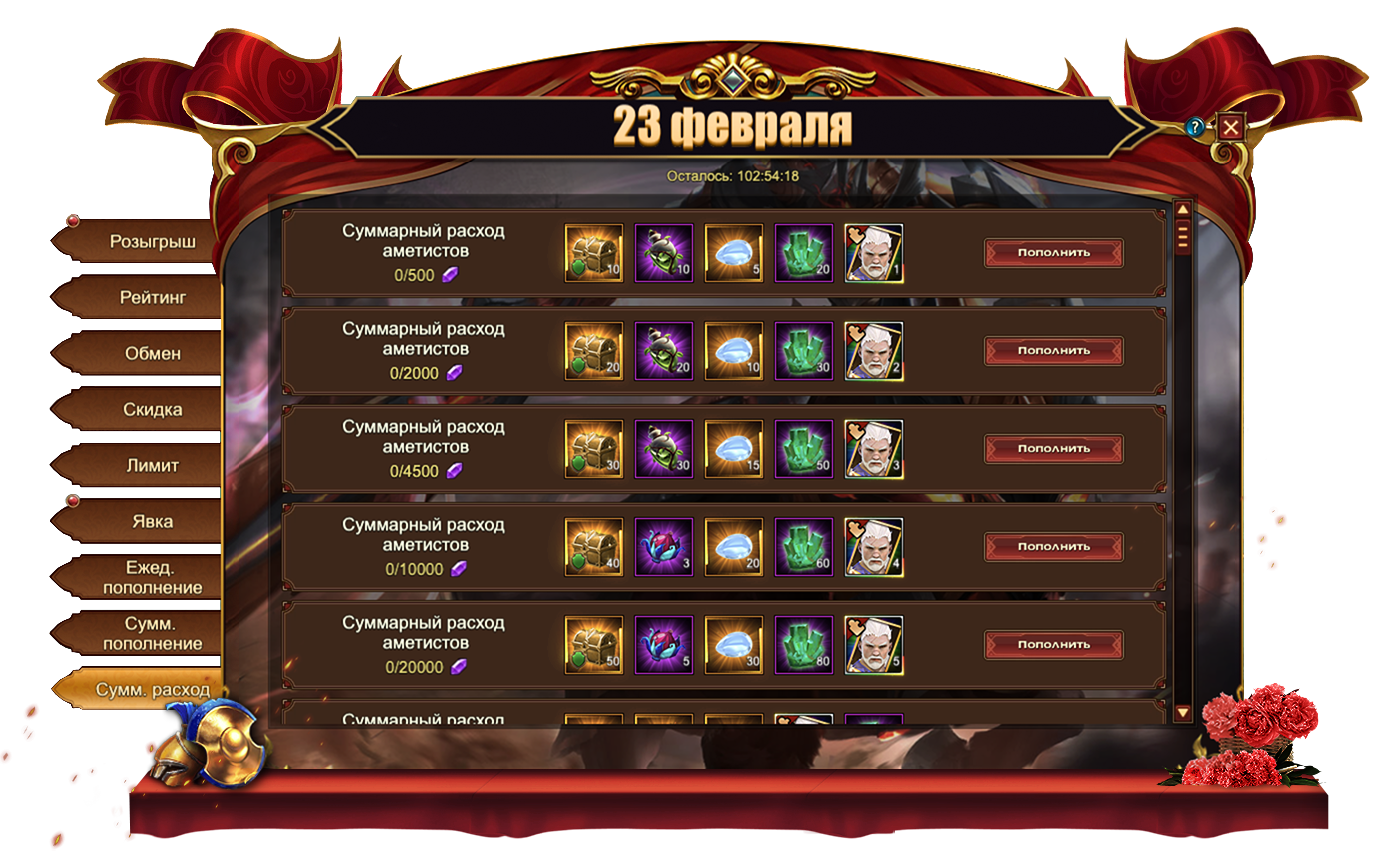 Обратите внимание, для активации скидки необходимо выполнить условие из первого столбца. Например, на скриншоте ниже, для приобретения со скидкой набора из 10 Орденов и 10 Букетов необходимо пополнить счет на 1000.