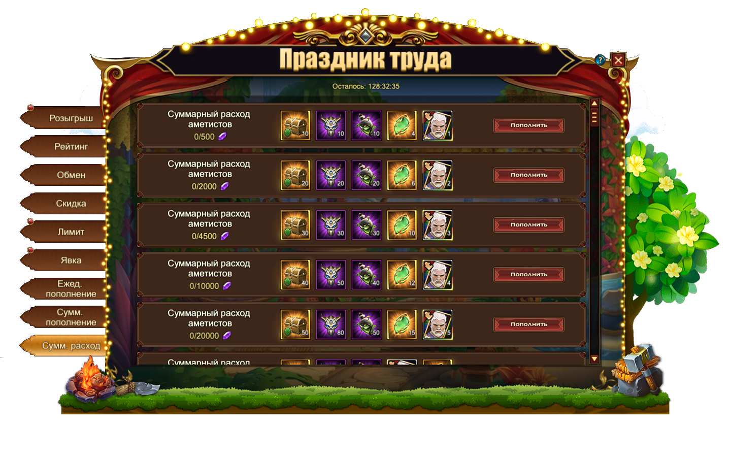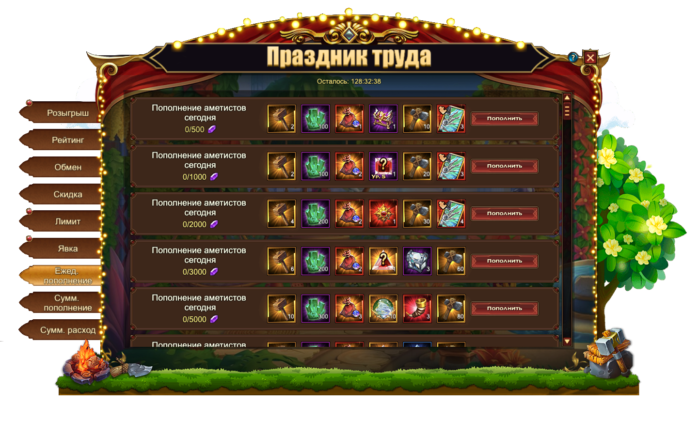 За пополнение счета на определенное количество аметистов за один день, вы можете получить: [Редк.] Стигмат, Изумруд, Сундук камней элементаля 4 ур., Сундук кристаллов 5 ур., Сундук самоцветов 6 ур., Киянка, Молоток, Дух крыльев святости, Сундук кристаллов 7 ур., Сундук кристаллов 9 ур., Сундук с эссенцией стигмата, Сущность артефакта, Сундук редкостей, Сундук с кодексом, Письмо с молитвой, Простой горн, Фрагмент Ядерного взрыва.