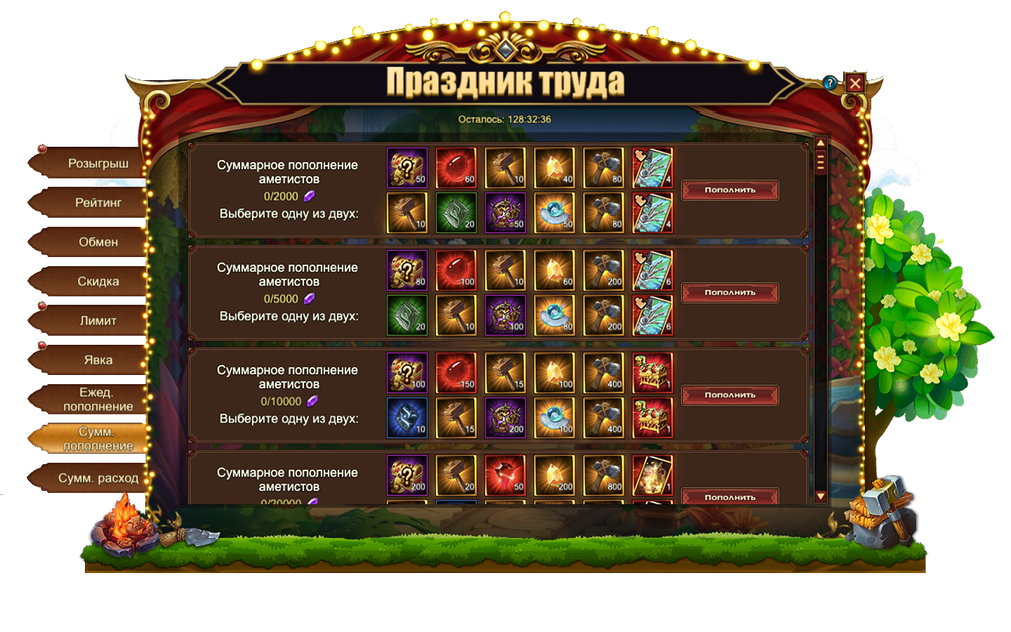 Обратите внимание, для активации скидки необходимо выполнить условие из первого столбца. Например, на скриншоте ниже, для приобретения со скидкой набора из 10 Киянок и 10 Молотков необходимо пополнить счет на 1000.