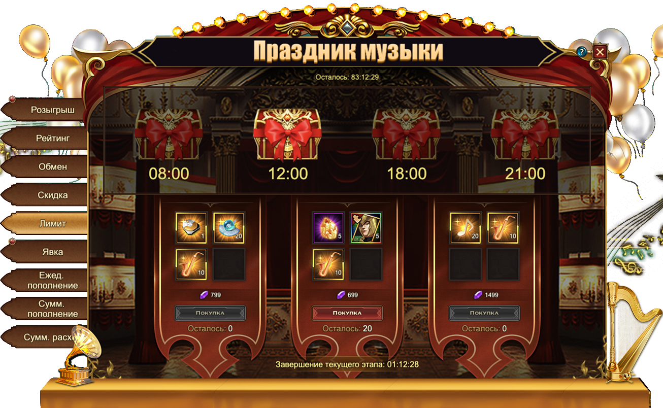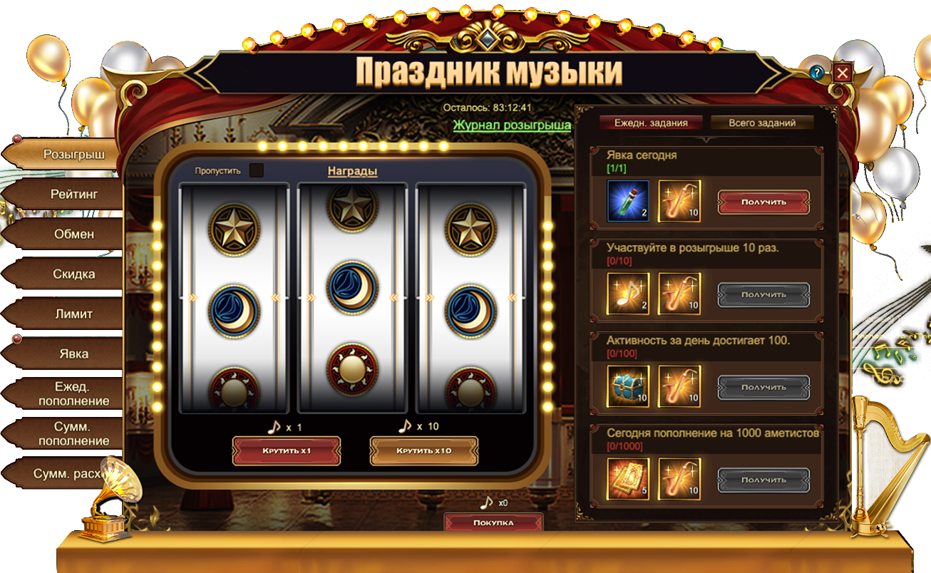 Участвуйте в розыгрыше различных ценных предметов, чтобы получить: Ядро Уру, Сундук самоцветов 6 ур., Песок темной звезды, Свиток славы, Частица сердца, Сила рода, Сундук души 3, Амфора мудрости, Фрагмент осуждения преступлений и даже Осуждение преступлений целиком!