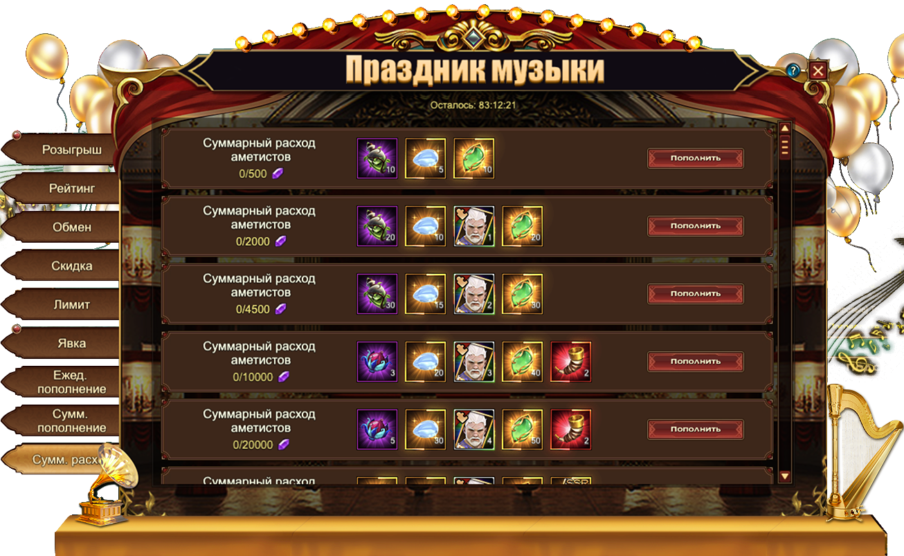 За пополнение счета на определенное количество аметистов за один день, вы можете получить: [Редк.] Стигмат, [Героич.] Стигмат, Сундук кристаллов 5 ур., Сундук камней элементаля 4 ур., Сундук самоцветов 6 ур., Нота, Саксофон, Эссенция талисмана, Сундук кристаллов 7 ур., Сундук кристаллов 9 ур., Сундук с эссенцией стигмата, Сундук книг навыков, Сущность артефактаСундук редкостей, Сундук карт UR, Письмо с молитвой, Фрагмент осуждения преступлений.