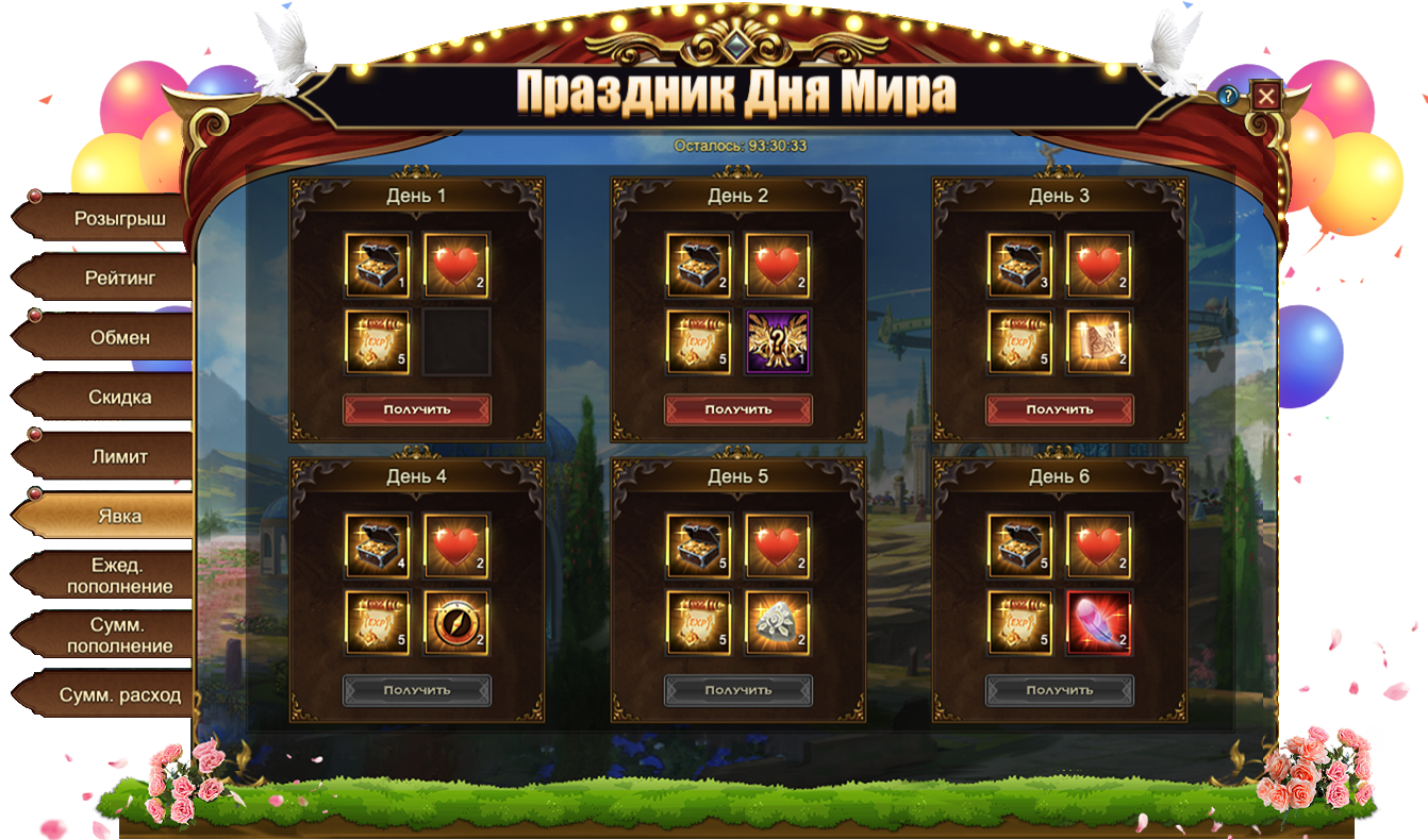 За посещение события ежедневно становятся доступны различные подарки. Например: Жетон дня мираСумка золотаОранжевый свиток опытаТитул Дня мираПотерянная картаПропуск на АренуКомпас, Перо феникса.