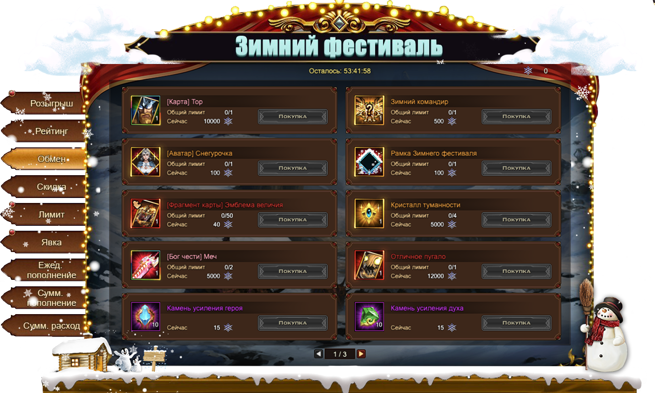 Снежинки, собранные во время данного Фестиваля, позволяют приобрести множество интересных предметов, в том числе и эксклюзивных для данного события: [Карта] Тор, титул Зимний командир[Аватар] СнегурочкаРамка Зимнего фестиваля[Фрагмент карты] Эмблема величия. Если эксклюзивные предметы вас не интересуют, всегда можно обменять Снежинки на полезные ресурсы. Например, на Кристалл туманности, [Бог чести] Меч или Отличное пугало