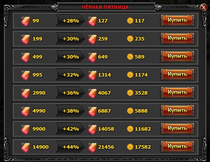Чем больше приобретаемый пакет игровой валюты, тем больше причитающийся бонус. Воспользуйтесь этим предложением, чтобы извлечь максимум из игровых событий «Сказка», «Фестиваль» и «Черная пятница», которые проходят в игре прямо сейчас!