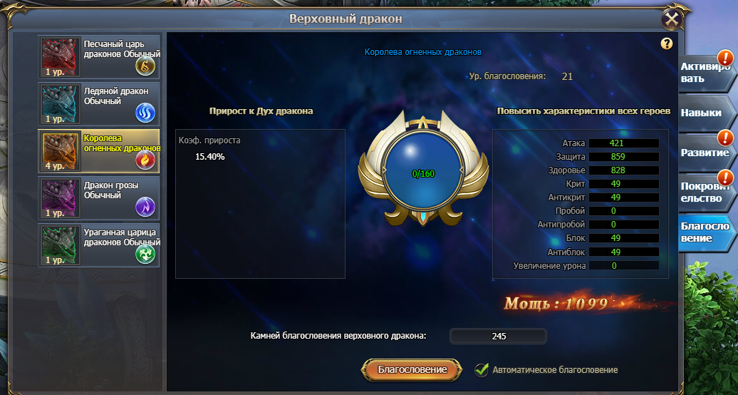 В функционале «Верховный дракон» появилась новая вкладка «Благословение», которая позволит вам усилить характеристики вашего отряда. Подробнее о видах «Благословения» можно узнать, прочитав данный гайд.