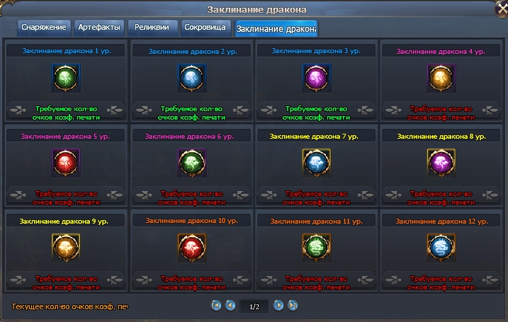 У игроков, достигших 170 уровня, в меню Снаряжение появится новый функционал - Заклинание дракона. С помощью очков печати, которые можно будет получить за ежедневную активность в меню Спирит и обменнике Межсерверных событий, вы активируете Заклинание дракона, которое значительно повысит ваши параметры!