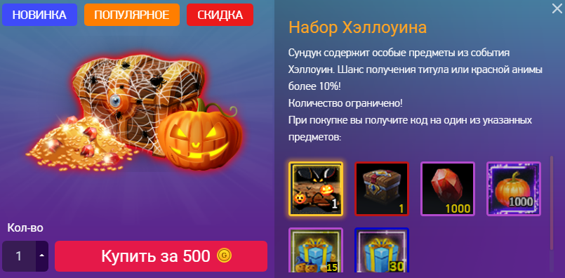 Откройте сундук, чтобы получить предметы для наборов Хэллоуина, очки магазина, риалы, а если повезет, можно вытащить и супер-приз: титул или красную аниму.