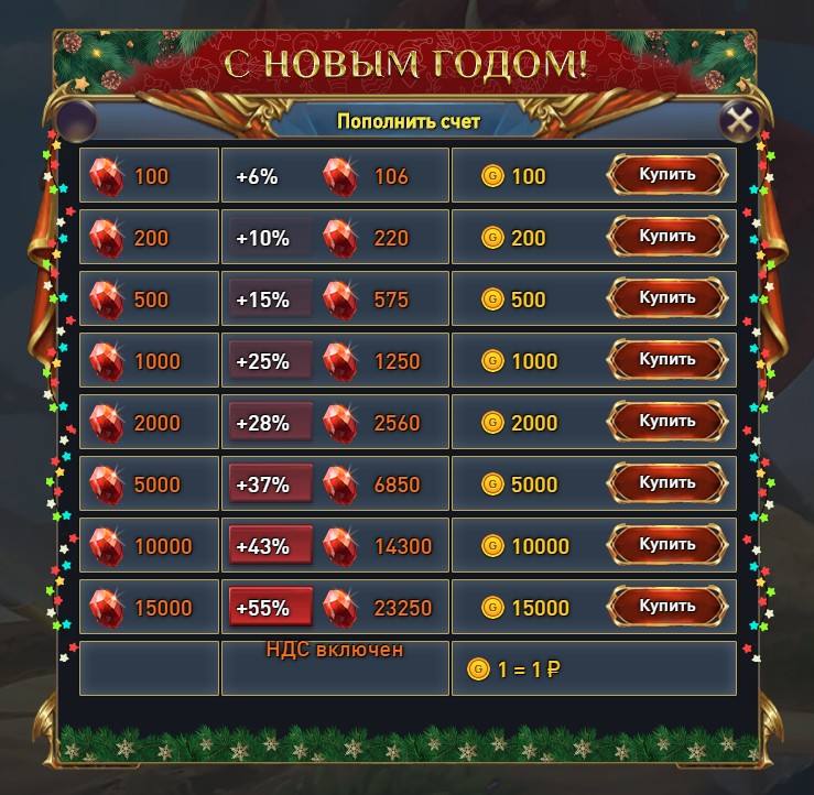 С 31 декабря по 5 января включительно приобретение игровой валюты будет намного выгоднее, ведь будет действовать система бонусов при покупке игровой валюты: чем выше сумма платежа, тем щедрее бонус.