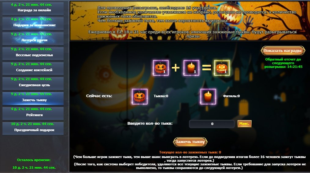 24 октября в игре стартует событие Хэллоуин длительностью 11 дней. Зажигайте тыквы и получайте подарки: