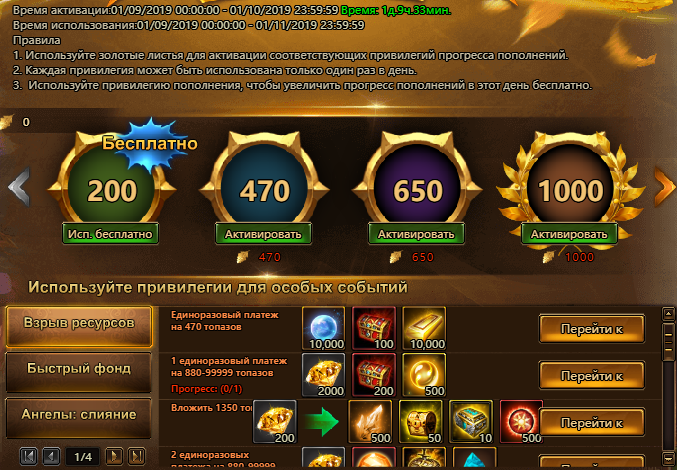 18 и 19 января не пропустите событие «Золотой пир»: пополняйте игровой счет и получайте волшебные золотые листья! Активируйте один из бонусов события и получите соответствующий прогресс пополнения в горячих событиях. Каждый из бонусов можно активировать только один раз.