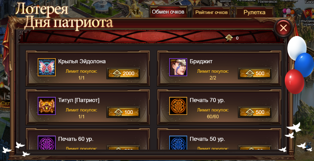 Для участия в рулетке вы можете использовать балены или Жетоны патриота, которые вы сможете получить в ивенте День Патриота.