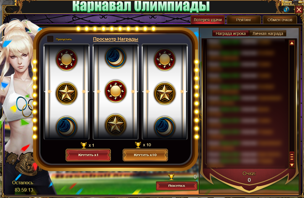 В нашем случае даже участие в Олимпиаде вознаграждается - заходите в событие ежедневно и получите Монеты лотереи, Сумки золота, Фиолетовые свитки опыта Особые свитки призыва. Награды предусмотрены и за суммы пополнений, и за расход, и за разовое пополнение баланса - Подковы надежды, Седло и Попона завоевателя, Кристаллы скакуна, Сундуки талисманов и многое-многое другое!