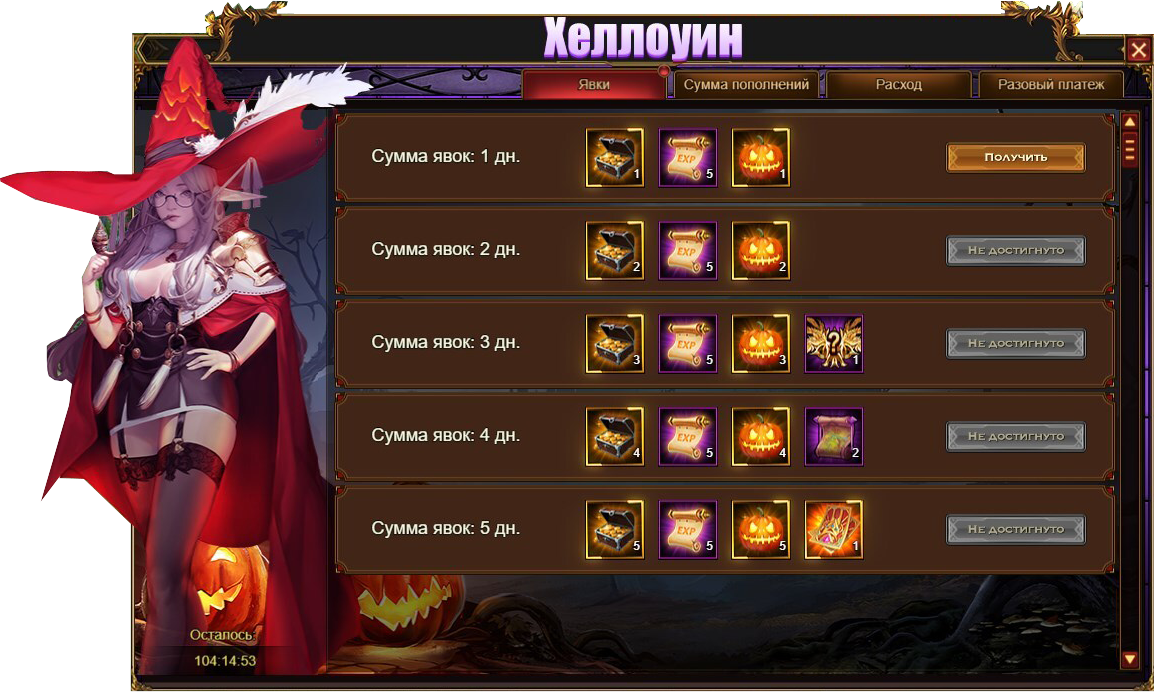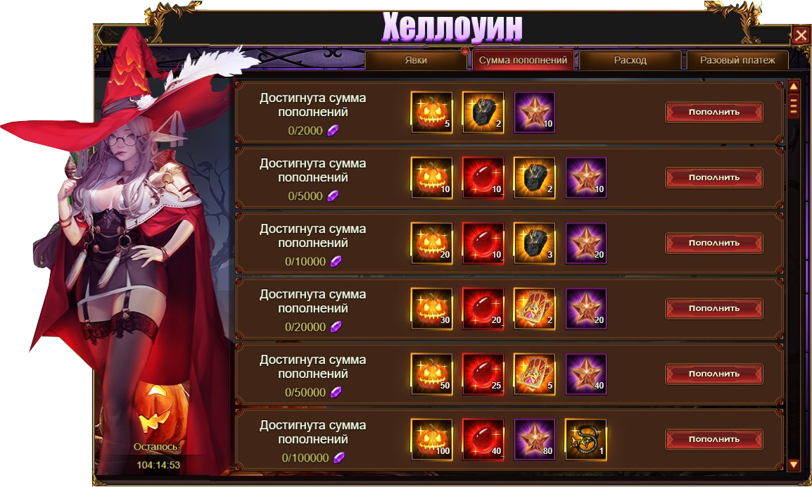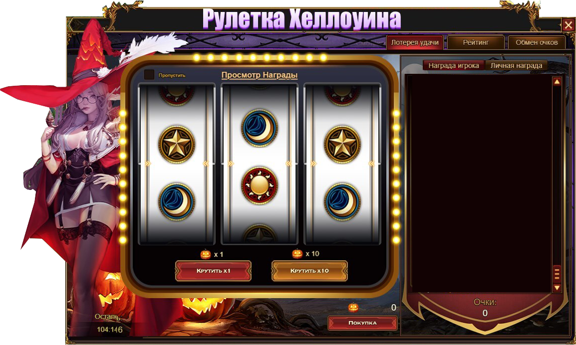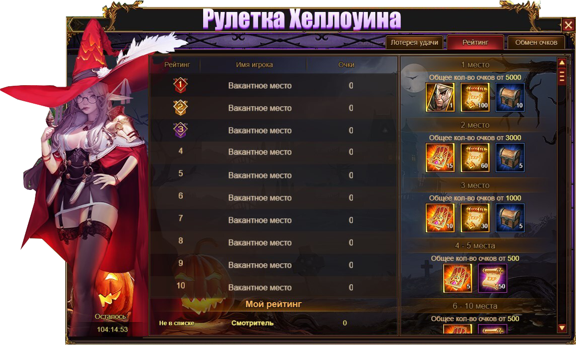 Каждое использование рулетки приносит вам очки события, отображаемые в Рейтинге Хэллоуина. Возьмите удачу за хвост и боритесь за главные призы рейтинга! Ведь [Карта] Утер, Оранжевый свиток опыта, Особый свиток призыва, Фиолетовый свиток опыта, Свиток Призыва и Сундук самоцветов пригодятся всем и каждому!
