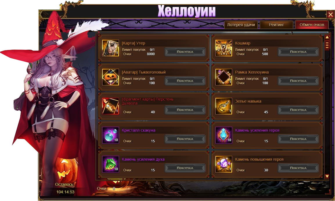 Полученные при использовании рулетки очки не будут лежать мертвым грузом! С их помощью вы сможете приобрести немало крутых тематических предметов во вкладке Обмен Очков. Например: аватар Тыквоголовый, титул Кошмар, рамка Хэллоуина. А если вам по душе чуть более обыденные вещи, то к вашим услугам карты героев, фрагменты артефактов и полезные для любого искателя приключений ресурсы.