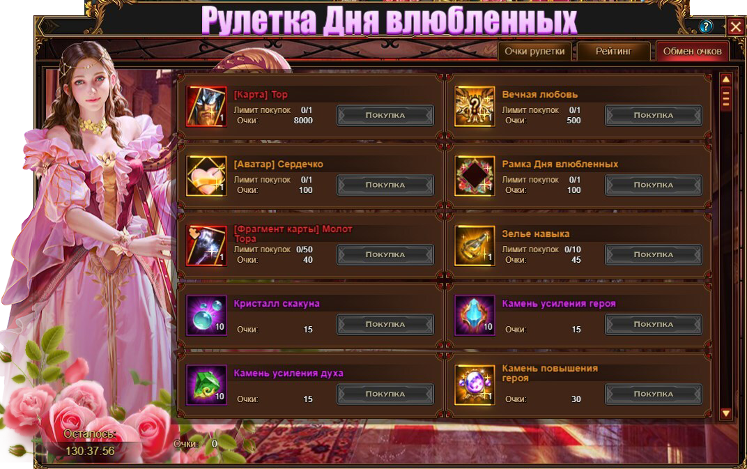 Полученные в рулетке очки можно использовать для получения целого спектра удивительных наград! Например, с их помощью вы можете приобрести тематические предметы: особый титул Вечная Любовь[Аватар] Сердечко и Рамку дня влюбленных. Также для обмена доступны всемогущий Тор, фрагменты артефактов и полезные для любого искателя приключений ресурсы.