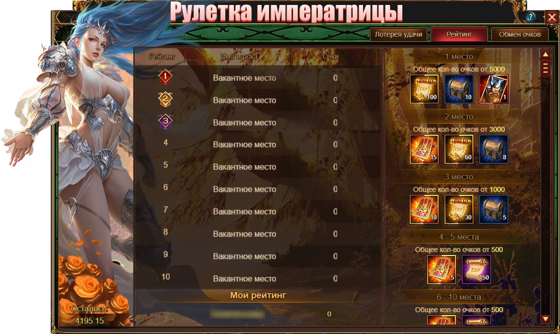 Полученные в рулетке очки можно использовать для получения целого спектра удивительных наград! Например, с их помощью вы можете приобрести тематические предметы: особый титул Великая Императрица[Аватар] Императрица и Рамку Императрицы. Также для обмена доступны могущественный Тор, фрагменты артефактов и полезные для любого искателя приключений ресурсы.