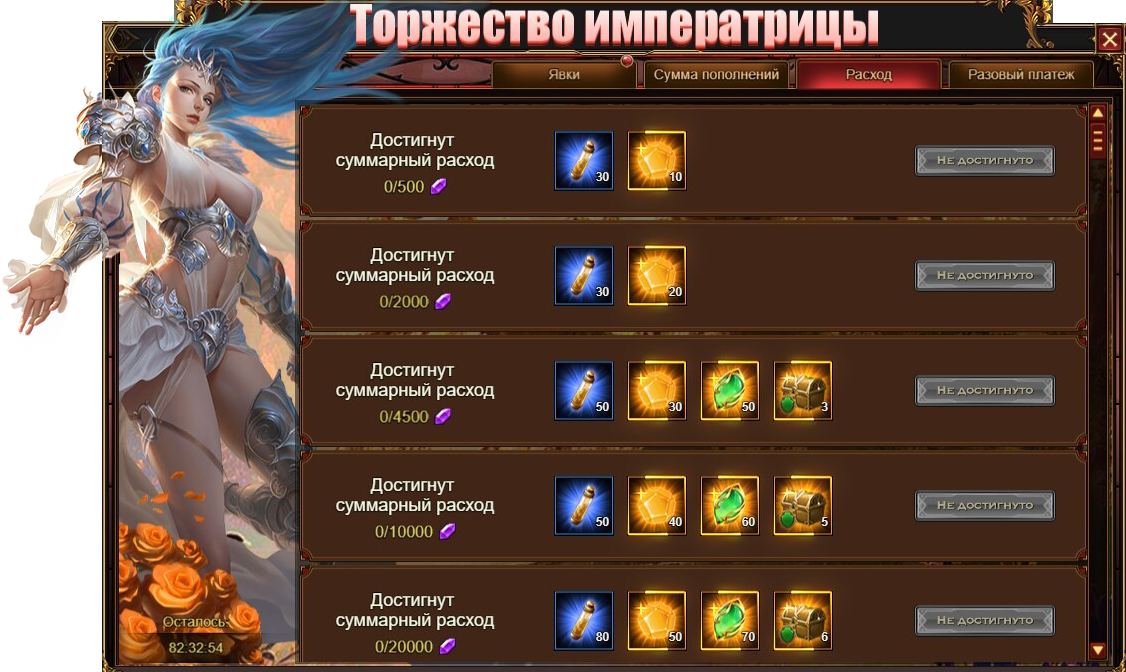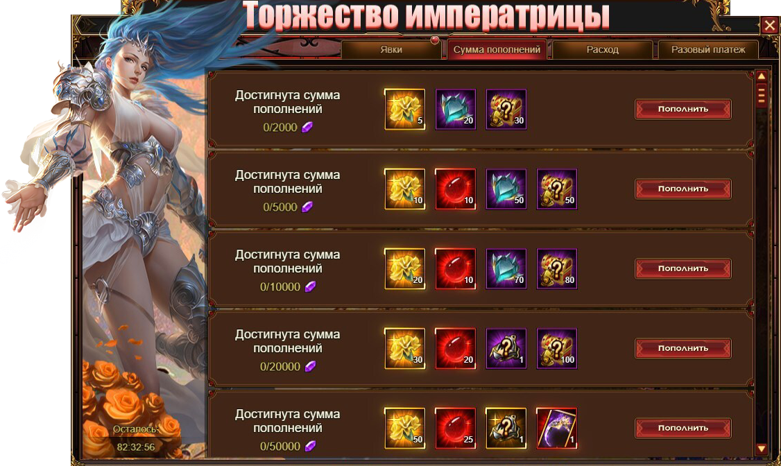 Пополните счет на определенные суммы за пять дней события и получите Монеты ИмператрицыКамни Мудрости, Кристаллы реликвии, Сундуки пробуждения богини, Сундук снаряжения скакуна (фиол.)Сундук снаряжения скакуна (оранж.), [Карта] Коса Смерти, [Карта] Тор и Богиню Льда