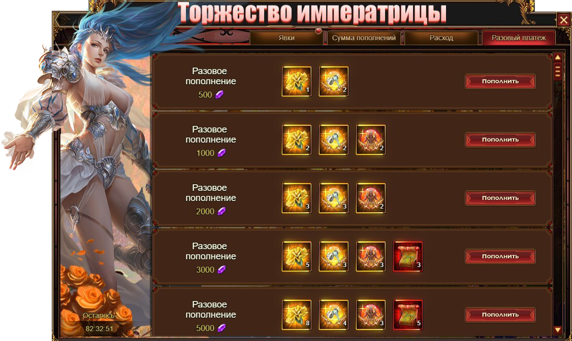 Разово пополните баланс на определенную сумму, чтобы получить Монеты ИмператрицыКристаллит, Сферы священного наряда, Особые карты сокровищ и Кодекс крыльев святости.