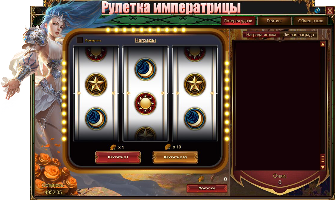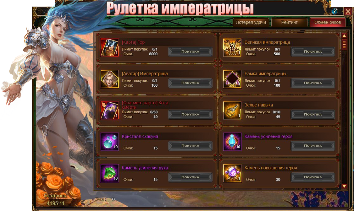 Полученные в рулетке очки можно использовать для получения целого спектра удивительных наград! Например, с их помощью вы можете приобрести тематические предметы: особый титул Великая Императрица[Аватар] Императрица и Рамку Императрицы. Также для обмена доступны могущественный Тор, фрагменты артефактов и полезные для любого искателя приключений ресурсы.