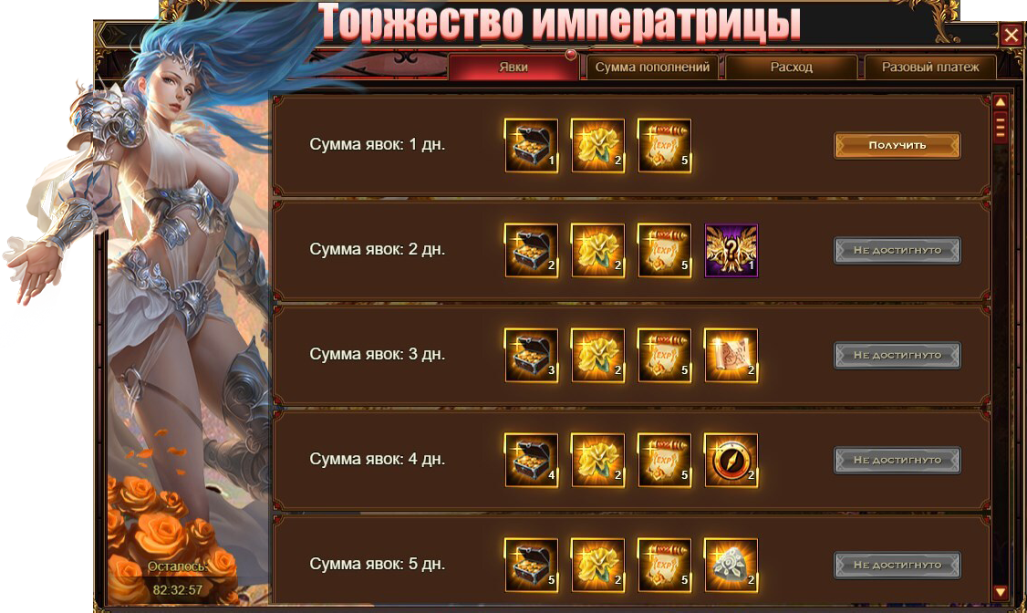 Пополните счет на определенные суммы за пять дней события и получите Монеты ИмператрицыКамни Мудрости, Кристаллы реликвии, Сундуки пробуждения богини, Сундук снаряжения скакуна (фиол.)Сундук снаряжения скакуна (оранж.), [Карта] Коса Смерти, [Карта] Тор и Богиню Льда