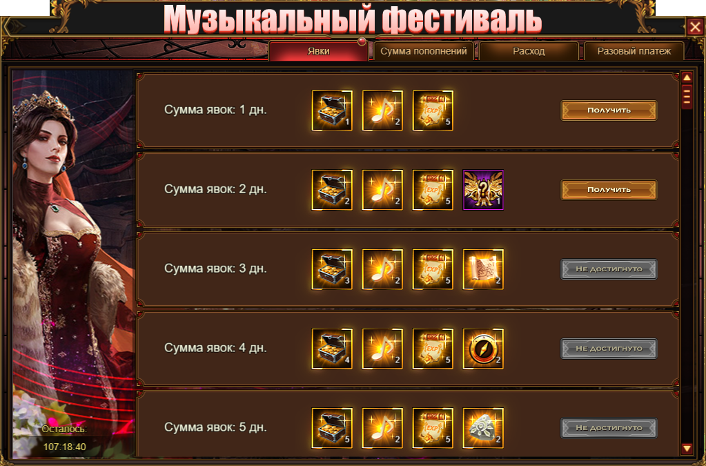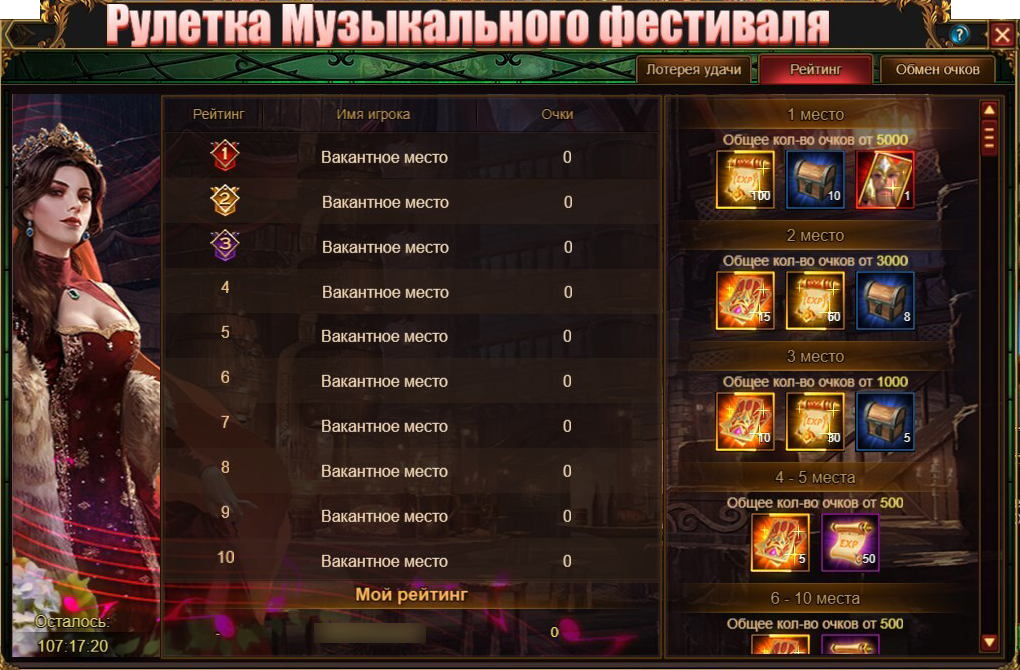 Каждое использование рулетки приносит вам очки события, отображаемые в Рейтинге Рулетки Музыкального фестиваля. В этот раз счастливчикам достанутся [Карта] Хеймдалль, Оранжевый свиток опыта, Особый свиток призыва, Фиолетовый свиток опыта, Свиток Призыва и Сундук самоцветов!