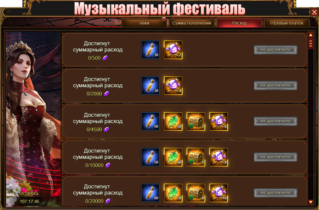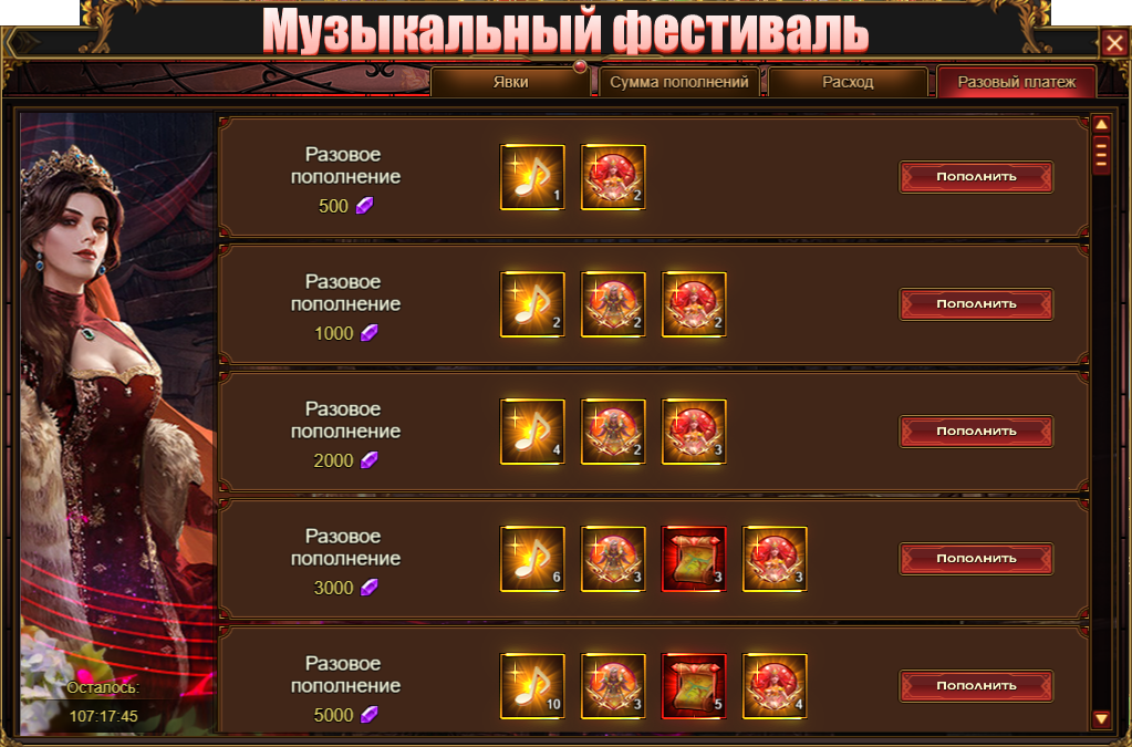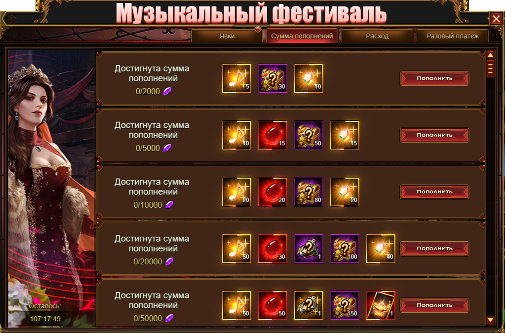 Разово пополните баланс на определенную сумму, чтобы получить Ноты, Кристаллит, Сферы священного наряда, Особые карты сокровищ, Души богини и Кодекс крыльев святости.