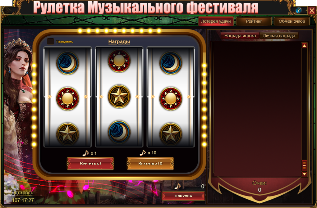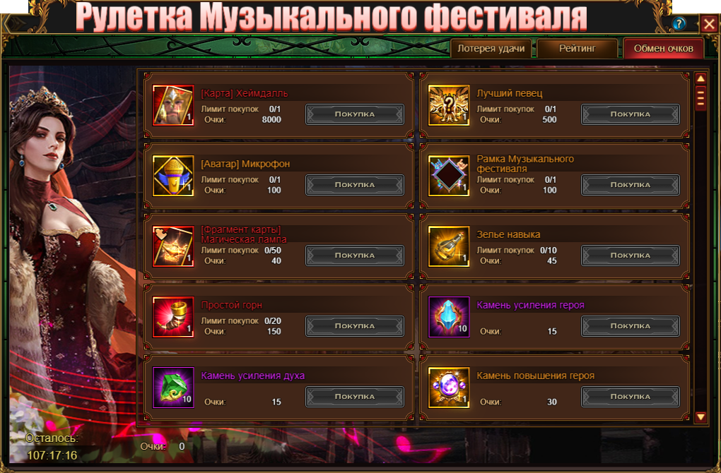 Полученные в рулетке очки можно использовать для получения целого спектра удивительных наград! Например, с их помощью вы можете приобрести тематические предметы: особый титул Лучший Певец, [Аватар] Микрофон и Рамку Музыкального фестиваля. Также для обмена доступны всевидящий Хеймдалль, фрагменты артефактов и полезные для любого искателя приключений ресурсы.